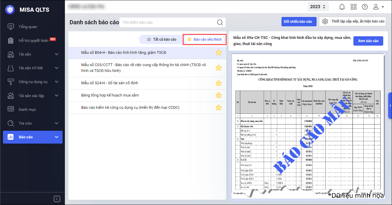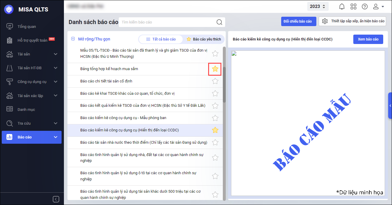 - Tại thanh menu bên trái, anh/chị chọn Báo cáo. Tại đây anh/chị có thể thêm báo cáo mình thường sử dụng bằng cách tích vào biểu tượng ngôi sao. Anh/chị có thể xem nhanh những báo cáo hay sử dụng tại mục Xem báo cáo yêu thích, Bỏ chọn tại biểu tượng ngôi sao để loại bỏ báo cáo ra khỏi danh sách yêu thích nếu cần.