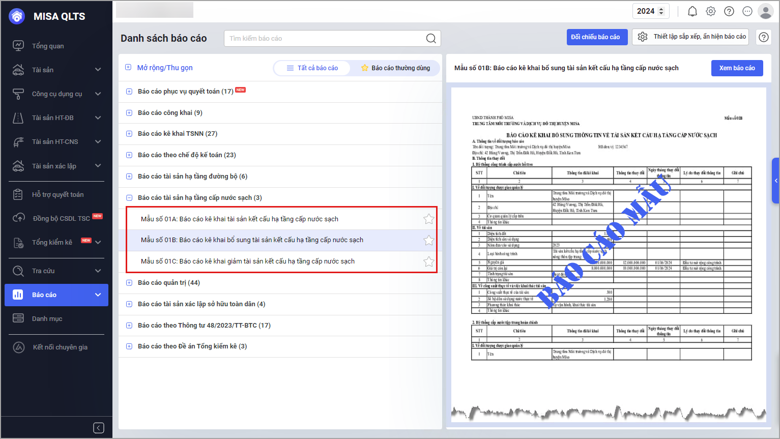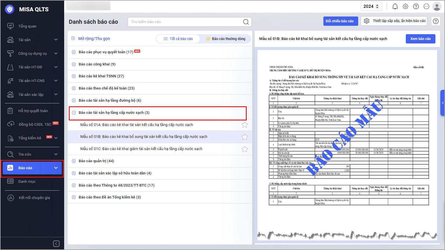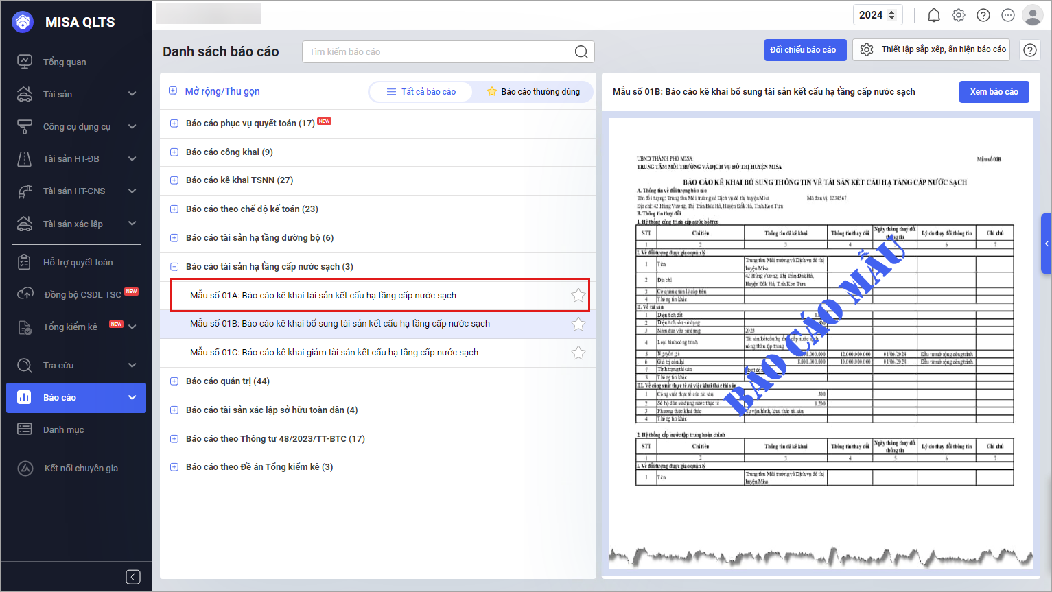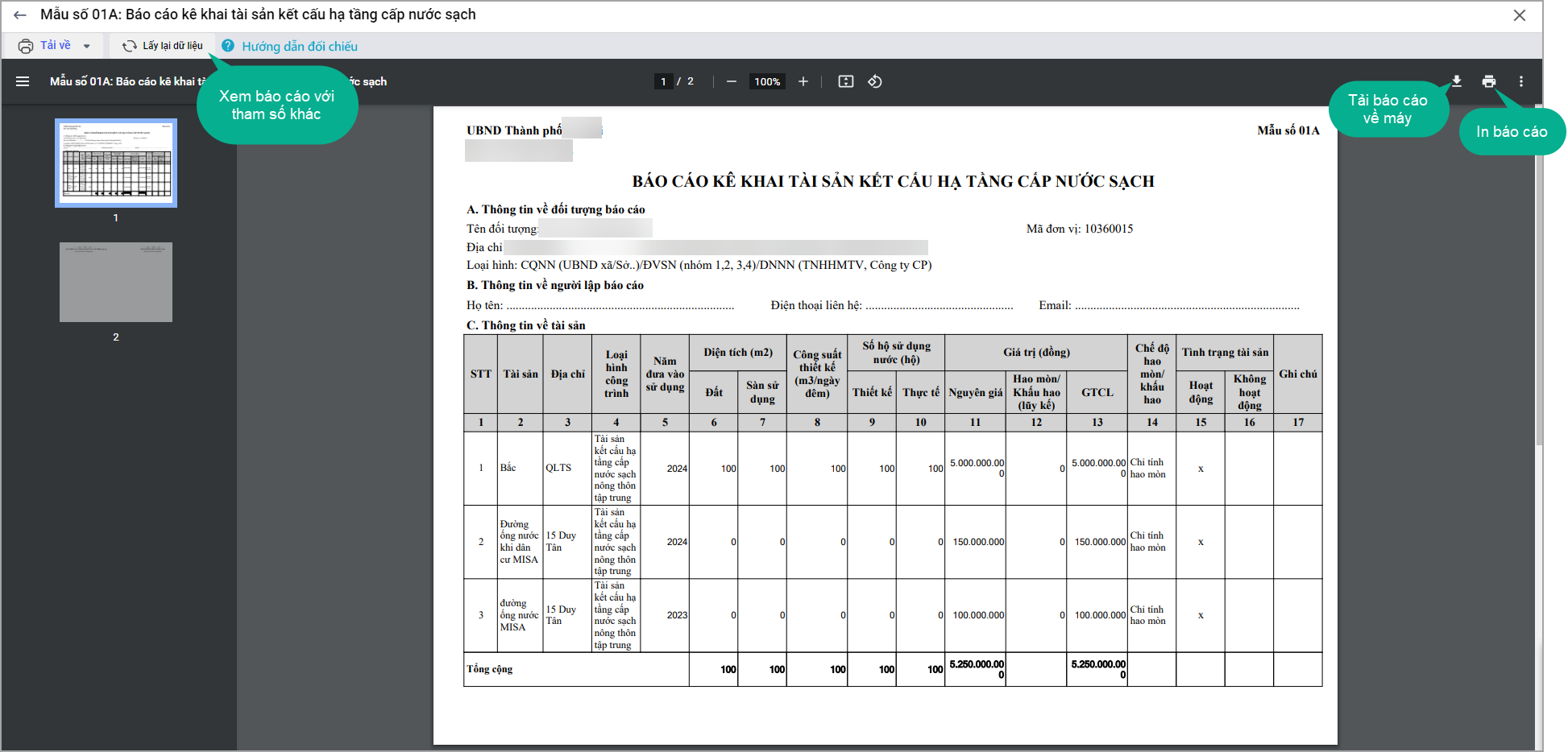 Ví dụ: in báo cáo Mẫu số 01A: Báo cáo kê khai tài sản kết cấu hạ tầng cấp nước sạch.