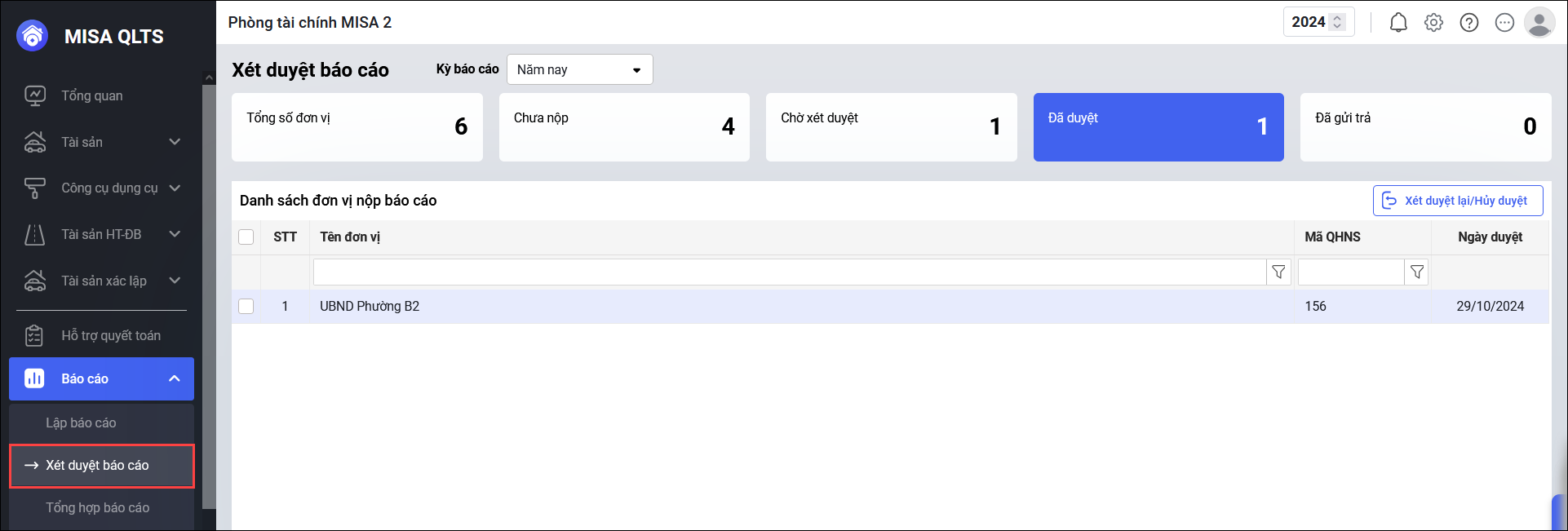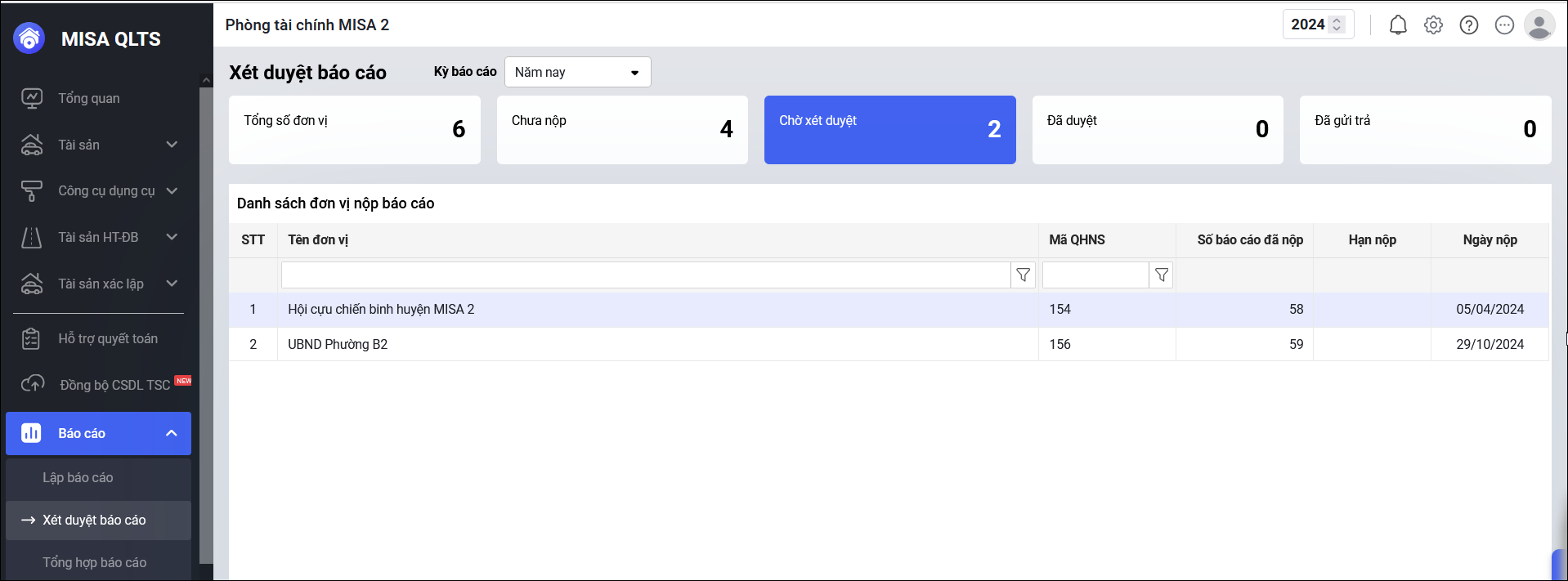Bước 2: Đơn vị cấp trên có thể theo dõi danh sách các đơn vị nộp báo cáo tại menu Báo cáo\Xét duyệt báo cáo.