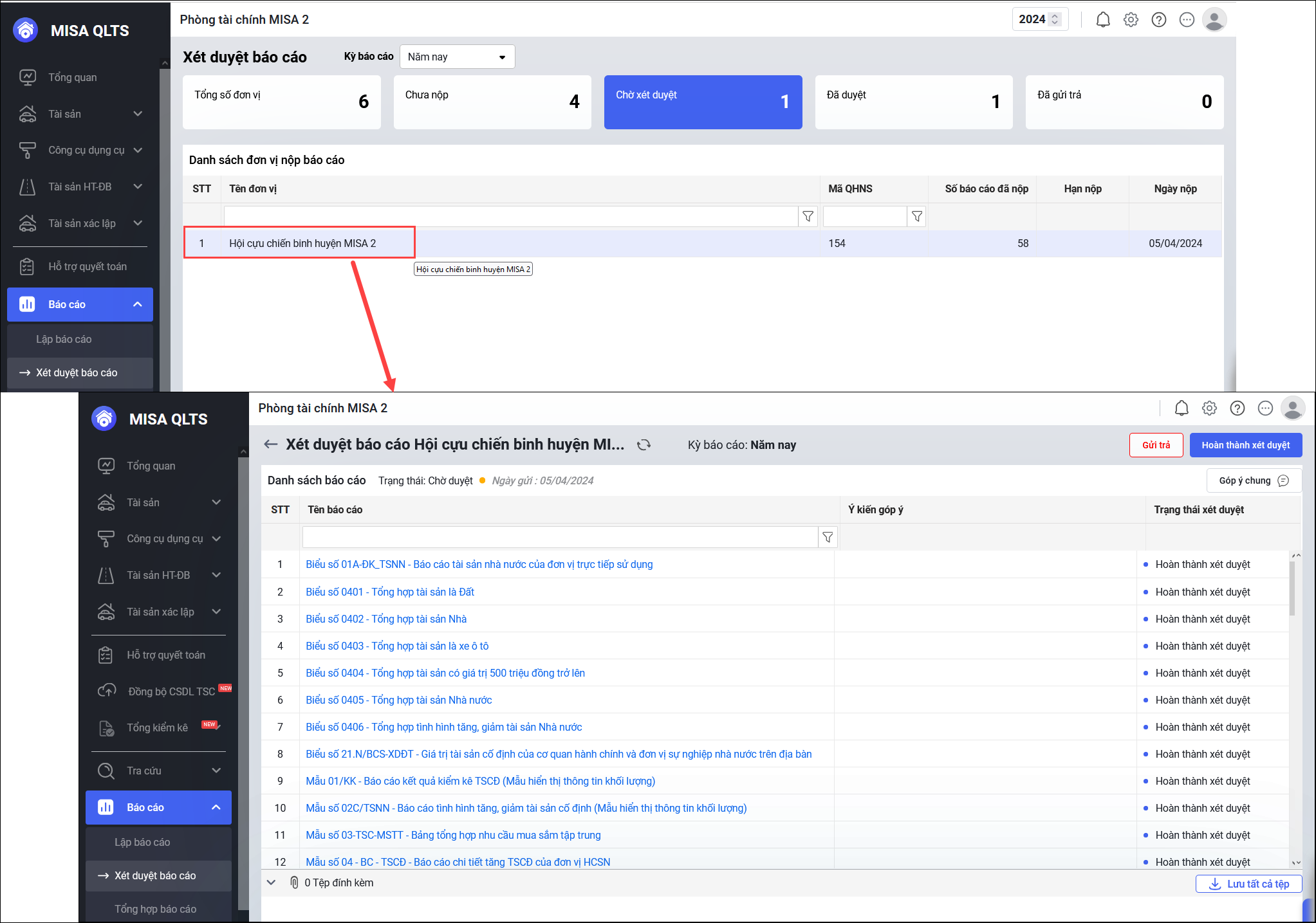 Bước 4: Với những đơn vị đang chờ xét duyệt, nhấn chuột vào tên đơn vị để mở xem danh sách báo cáo đã nộp.
