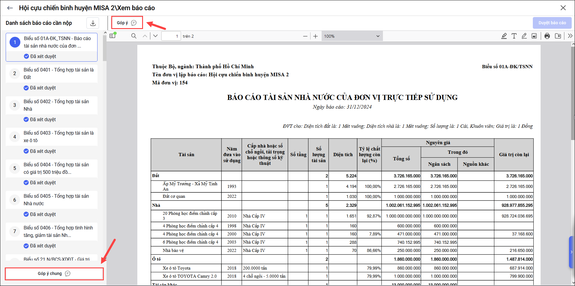 - Nhấn chuột vào báo cáo để xem chi tiết. Tại đây anh/chị có thể xét duyệt từng báo cáo. Nếu duyệt báo cáo thì nhấn Hoàn thành. Nếu cần ghi chú góp ý cho từng báo cáo thì nhấn Góp ý. Phần mềm cũng cho phép in báo cáo hoặc tải xuống dạng file pdf.