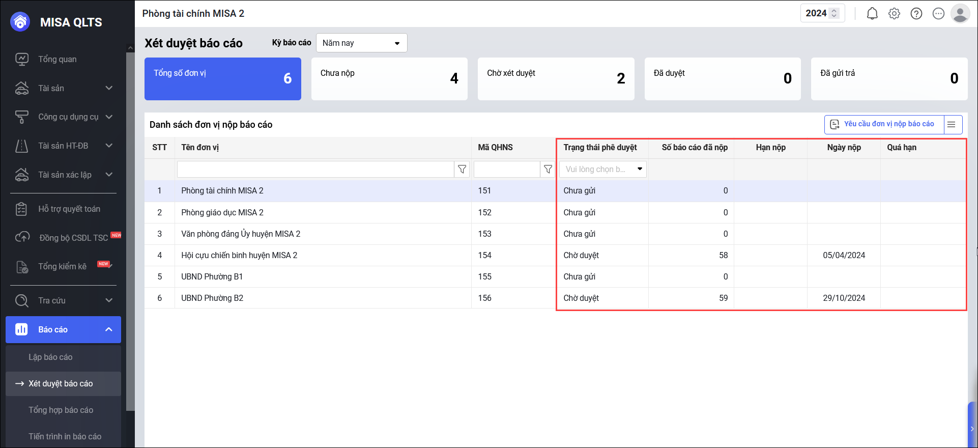 - Tại mục Tổng hợp đơn vị: Danh sách đơn vị cấp dưới, tình trạng đã nộp/chưa nộp báo cáo, số báo cáo đã nộp, trạng thái phê duyệt, hạn nộp, ngày nộp, số ngày quá hạn.