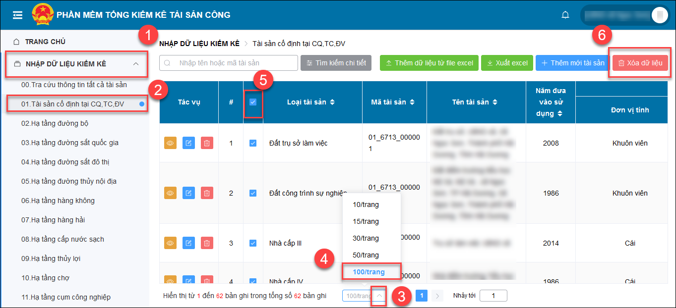 - Tại thanh menu bên tay trái, nhấn chọn NHẬP DỮ LIỆU KIỂM KÊ và chọn chi tiết loại hình dữ liệu kiểm kê đã nhập. Chẳng hạn chọn tab 01. Tài sản cố định tại CQ,TC, ĐV.