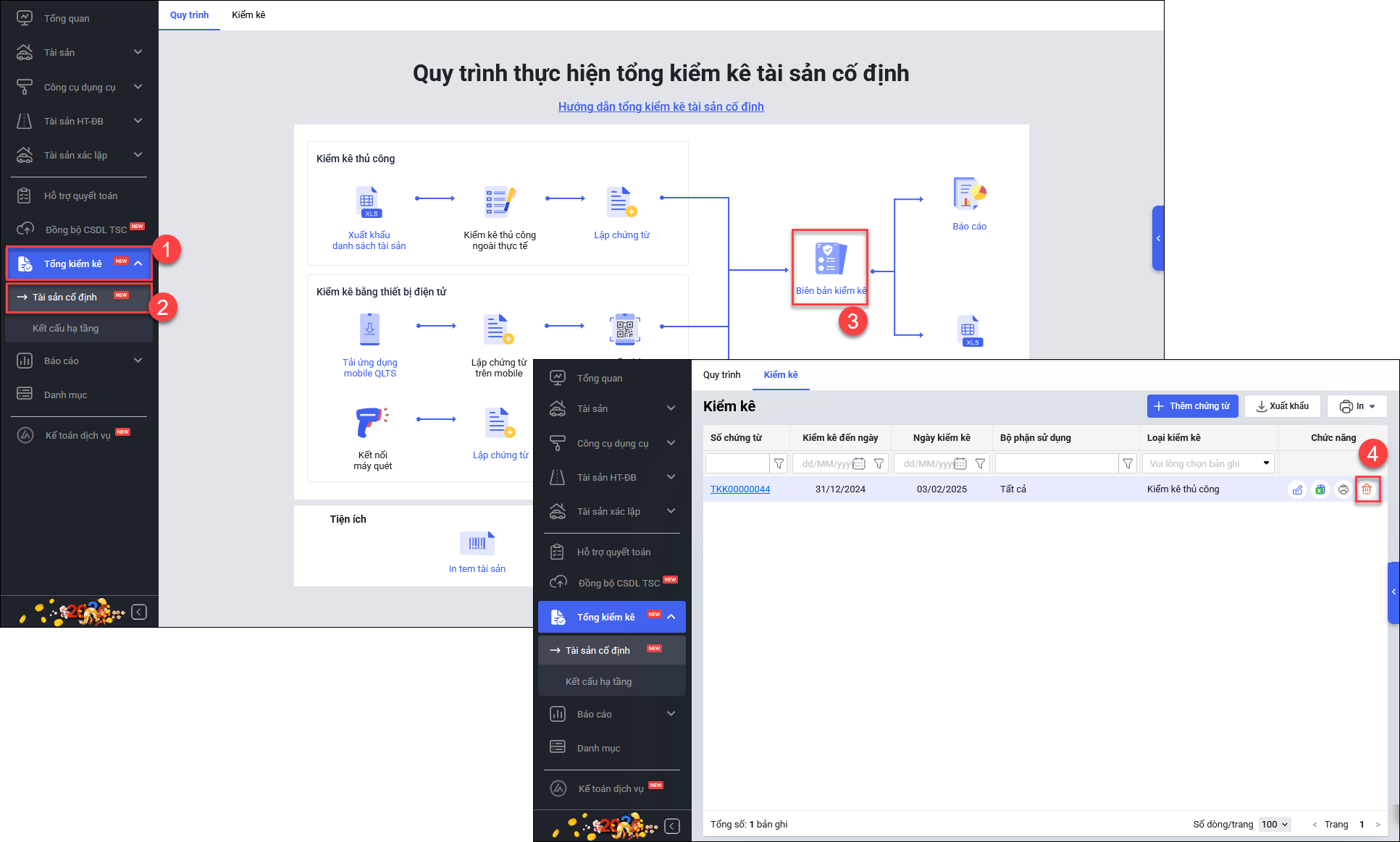 - Xóa chứng từ Tổng kiểm kê tài sản trên phần mềm iGOV Tài sản.