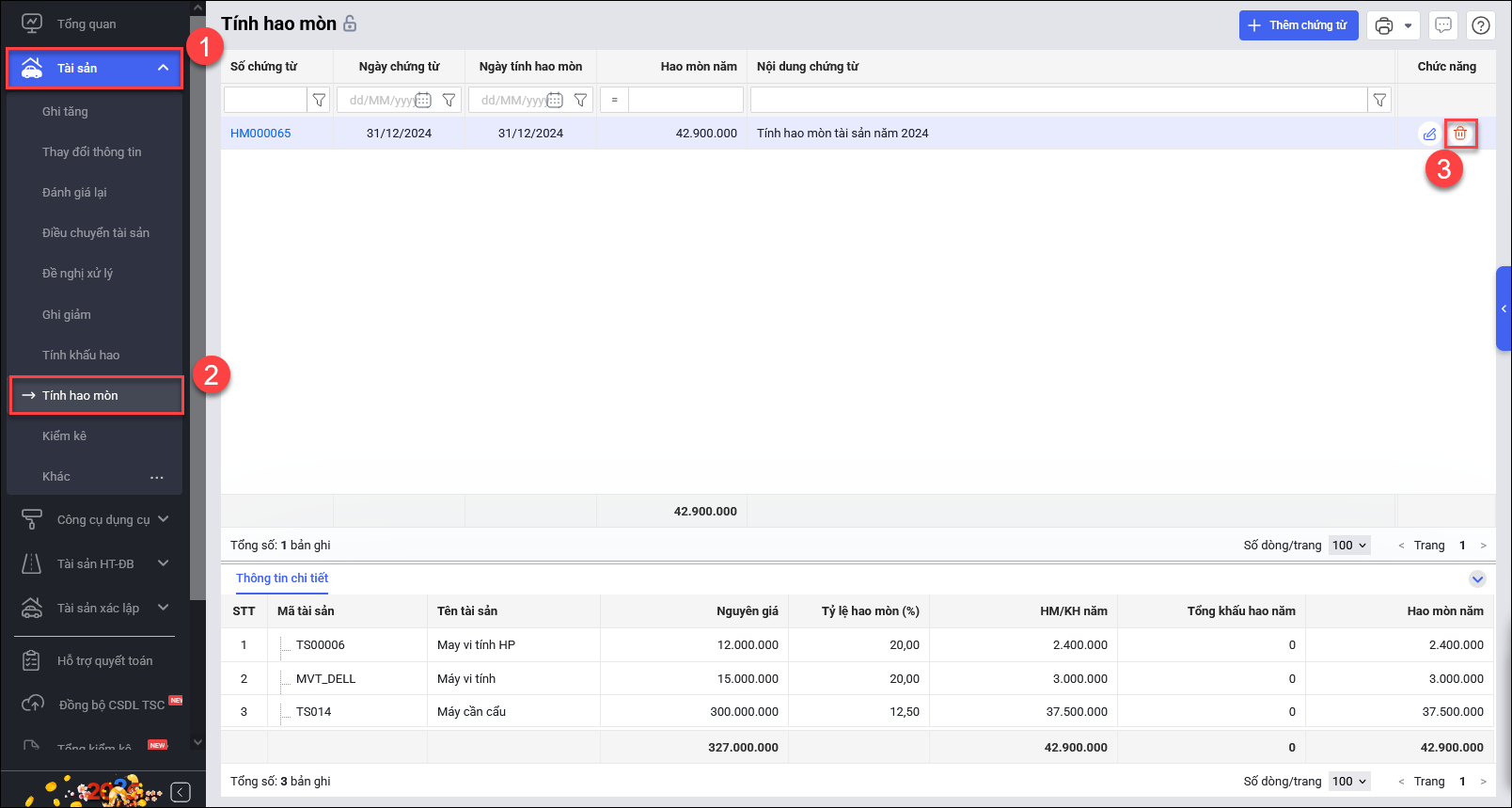 - Xóa chứng từ tính hao mòn, khấu hao (nếu có).