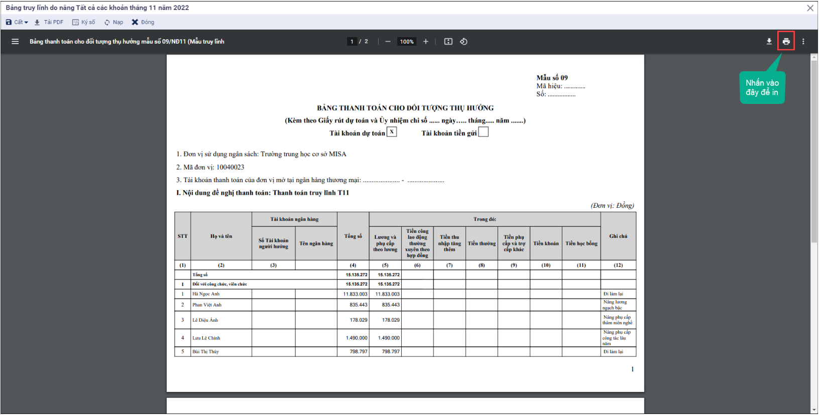 - Bước 3: Vào lại danh sách đang lập, nhấn Cập nhật thông tin hồ sơ để cập nhật lại thông tin trên danh sách.