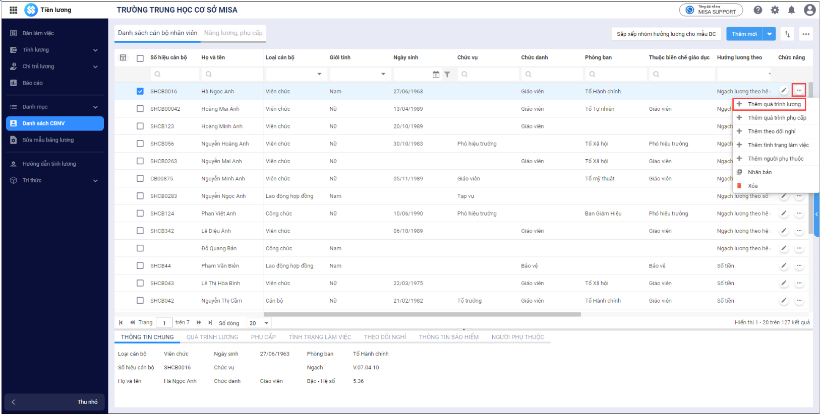 • Trong trường hợp cá nhân chưa được khai báo, hoặc anh/chị muốn thêm nhanh cá nhân đó lên phần mềm, anh/chị nhấn nhấn mũi tên, chọn Thêm mới hồ sơ để thêm nhanh cá nhân đó. Khai báo đầy đủ các thông tin cho cá nhân, bao gồm: