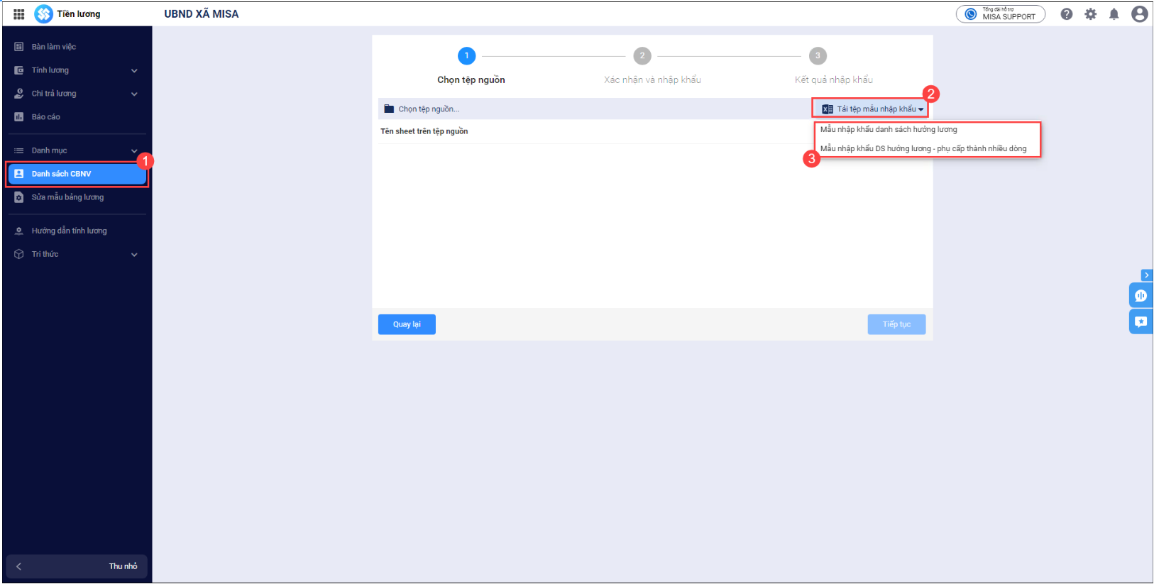 • Sau khi nhập dữ liệu trong file, anh/chị tải file lên phần mềm và nhấn Tiếp tục.