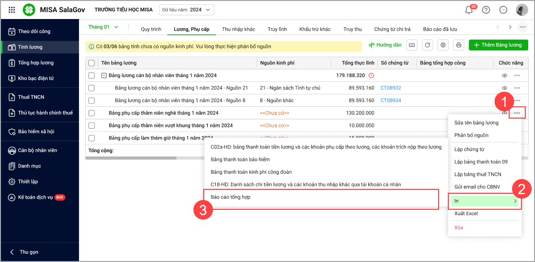 Bước 1: Tại Bảng lương, phụ cấp, anh/chị chọn dấu ba chấm ⋯ tại tham số In phần mềm đã bổ sung Báo cáo tổng hợp.