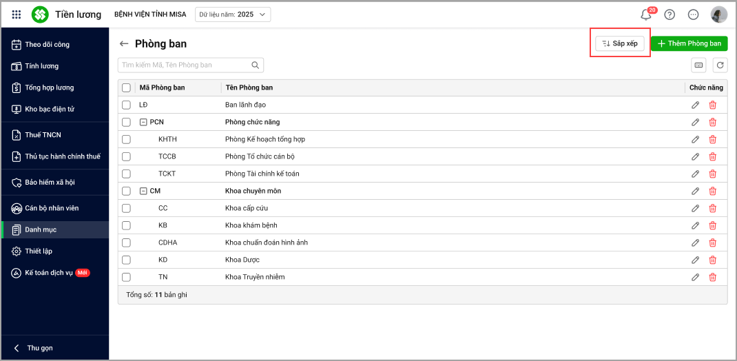Bước 2: Tại danh sách Phòng ban, phần mềm bổ sung chức năng Sắp xếp, cho phép: