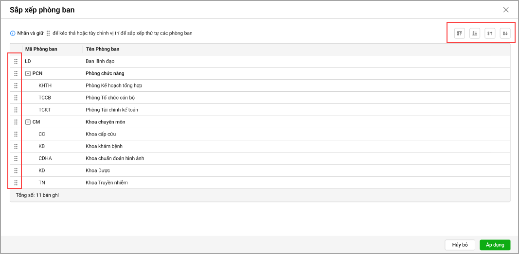 - Kéo thả để thay đổi thứ tự phòng ban.