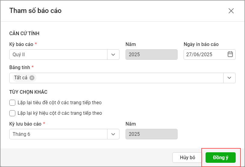 Bước 2: Anh/chị chọn Báo cáo tổng hợp và khai báo tham số, chọn Đồng ý.