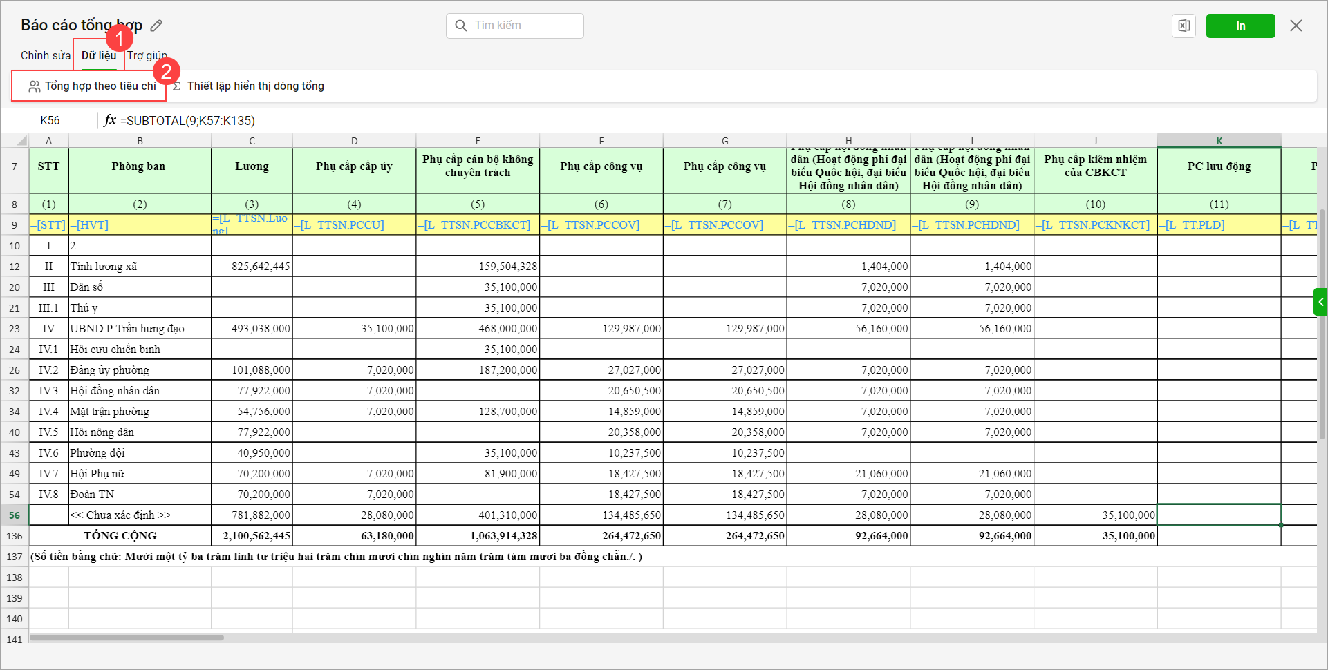 Bước 4: Để lập được báo cáo tổng hợp thu nhập nhanh chóng theo các tiêu chí: phòng ban, loại cán bộ, chức vụ chức danh, biên chế. Tại báo cáo, anh/chị chọn tab Dữ liệu\Tổng hợp theo tiêu chí.