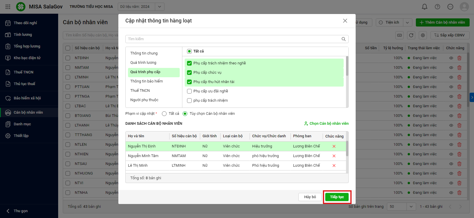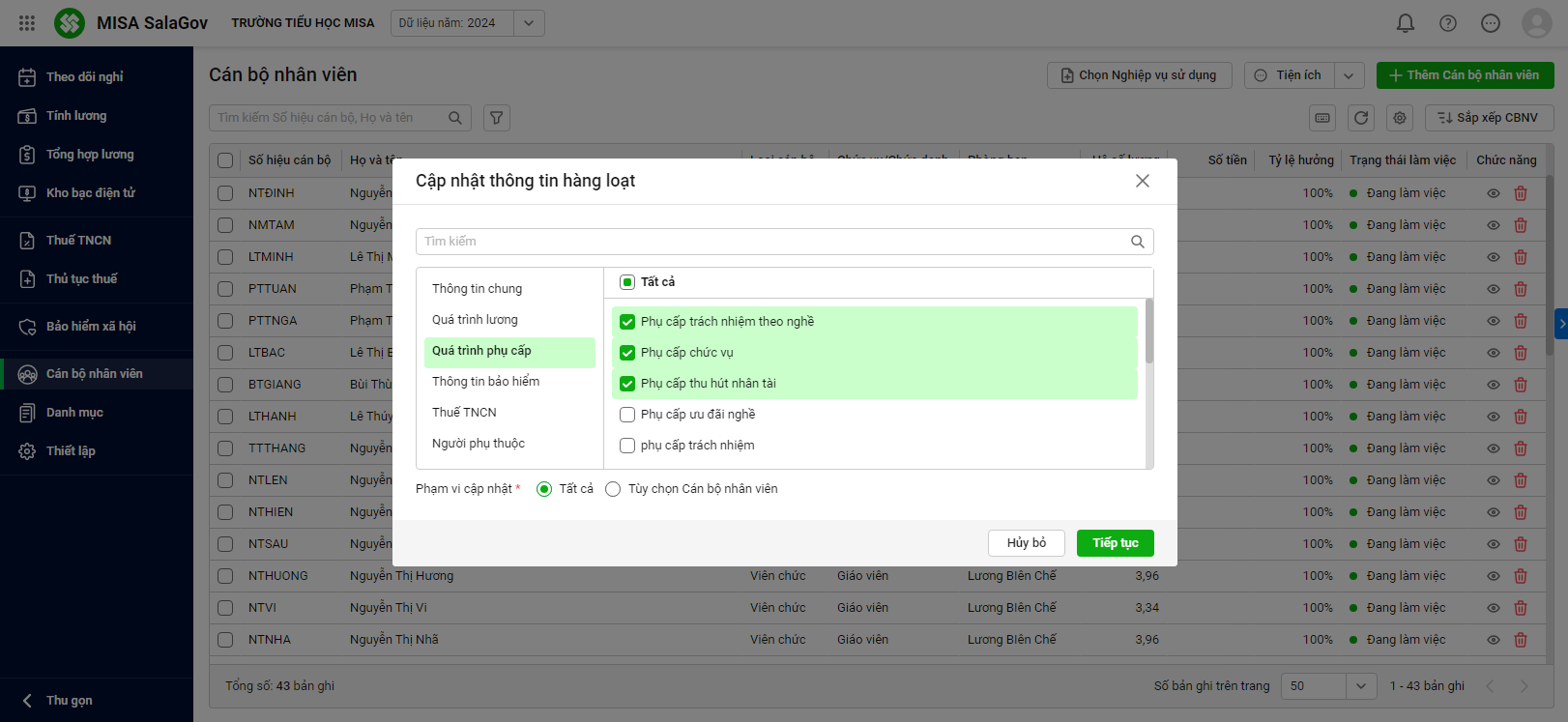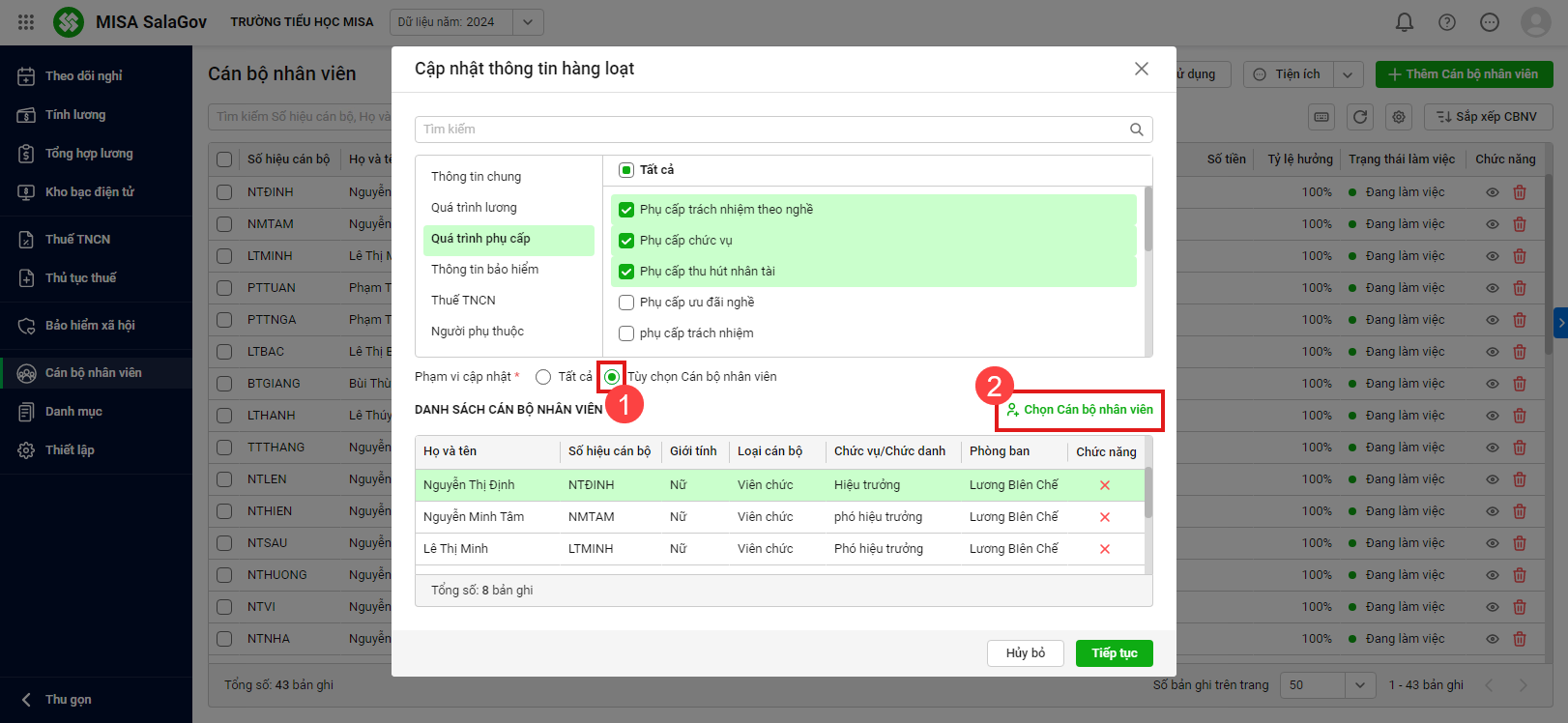 Bước 3. Chọn Phạm vi cập nhật tương ứng, nếu chỉ có 1 vài CBNV được cập nhật thông tin này anh/chị tích chọn Tùy chọn Cán bộ nhân viên và tích Chọn CBNV tương ứng.