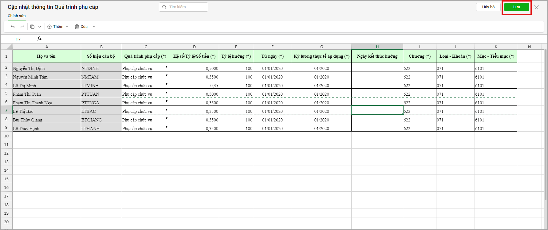 Ví dụ: Anh/chị muốn thay đổi thông tin chương, khoản của quá trình phụ cấp của CBNV, cụ thể là: Phụ cấp trách nhiệm theo nghề, Phụ cấp chức vụ và Phụ cấp thu hút nhân tài, anh/chị sẽ thực hiện khai báo như sau:
