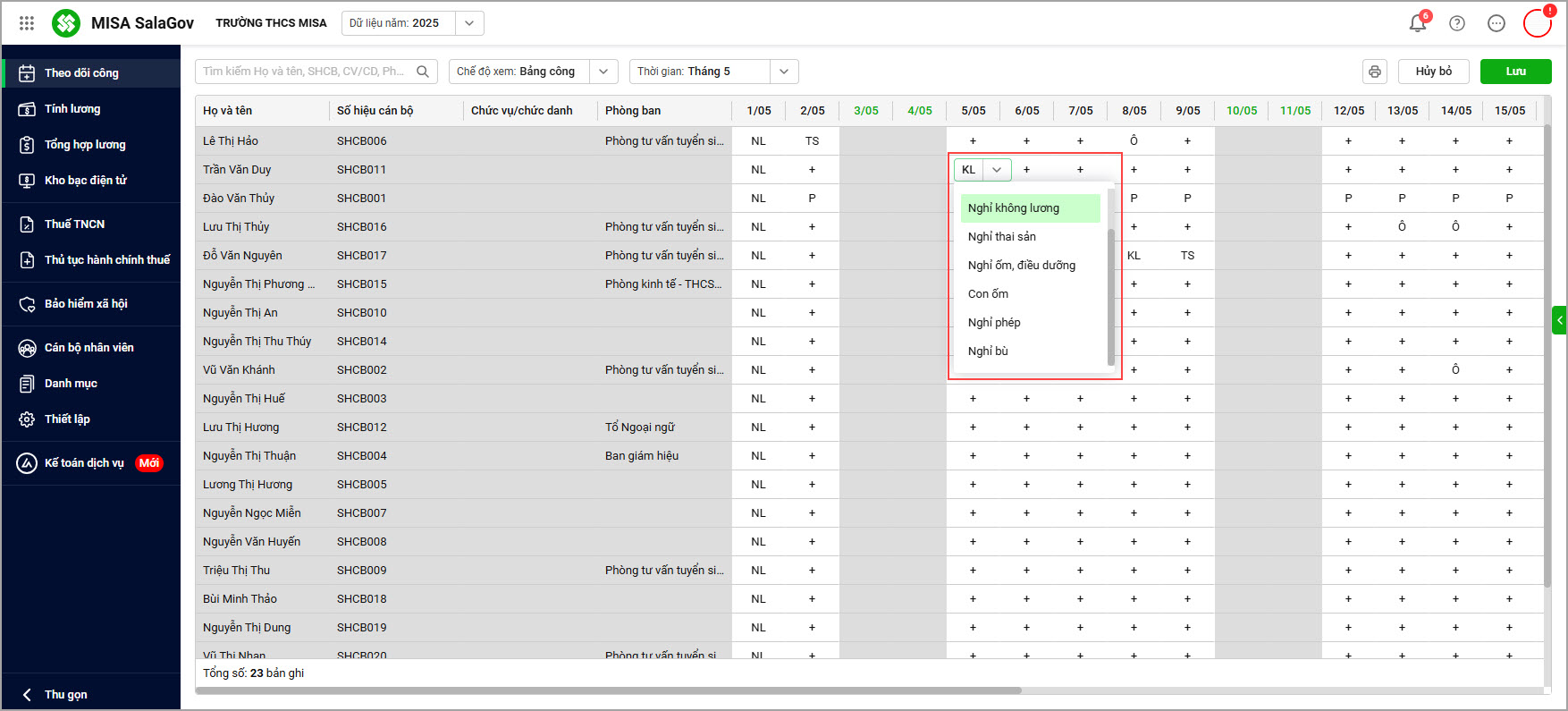 Bài viết này hướng dẫn anh/chị cách theo dõi và quản lý ngày công của cán bộ nhân viên (CBNV) trên phần mềm. Việc theo dõi công giúp ghi nhận chính xác thời gian làm việc, nghỉ phép, nghỉ ốm, nghỉ thai sản, làm thêm… của từng CBNV trong tháng. Từ đó làm căn cứ để tính và chi trả lương, phụ cấp đúng theo thời gian làm việc, nghỉ hoặc thai sản của từng cán bộ nhân viên.