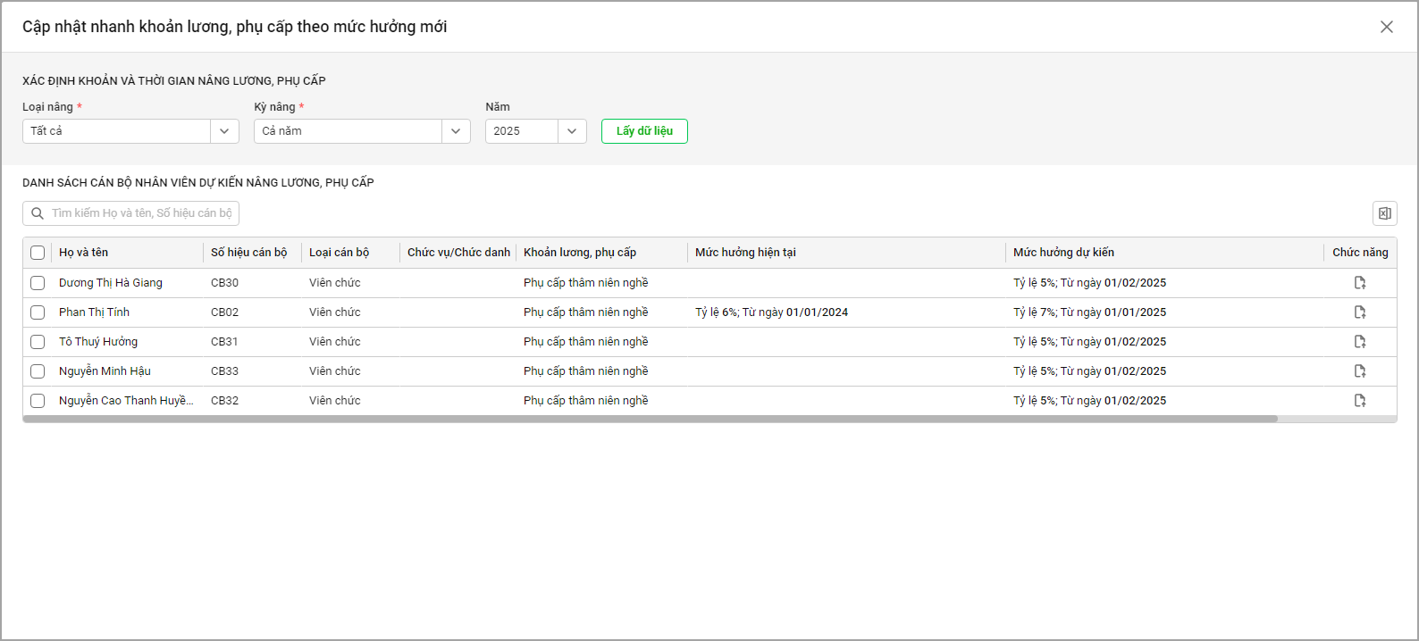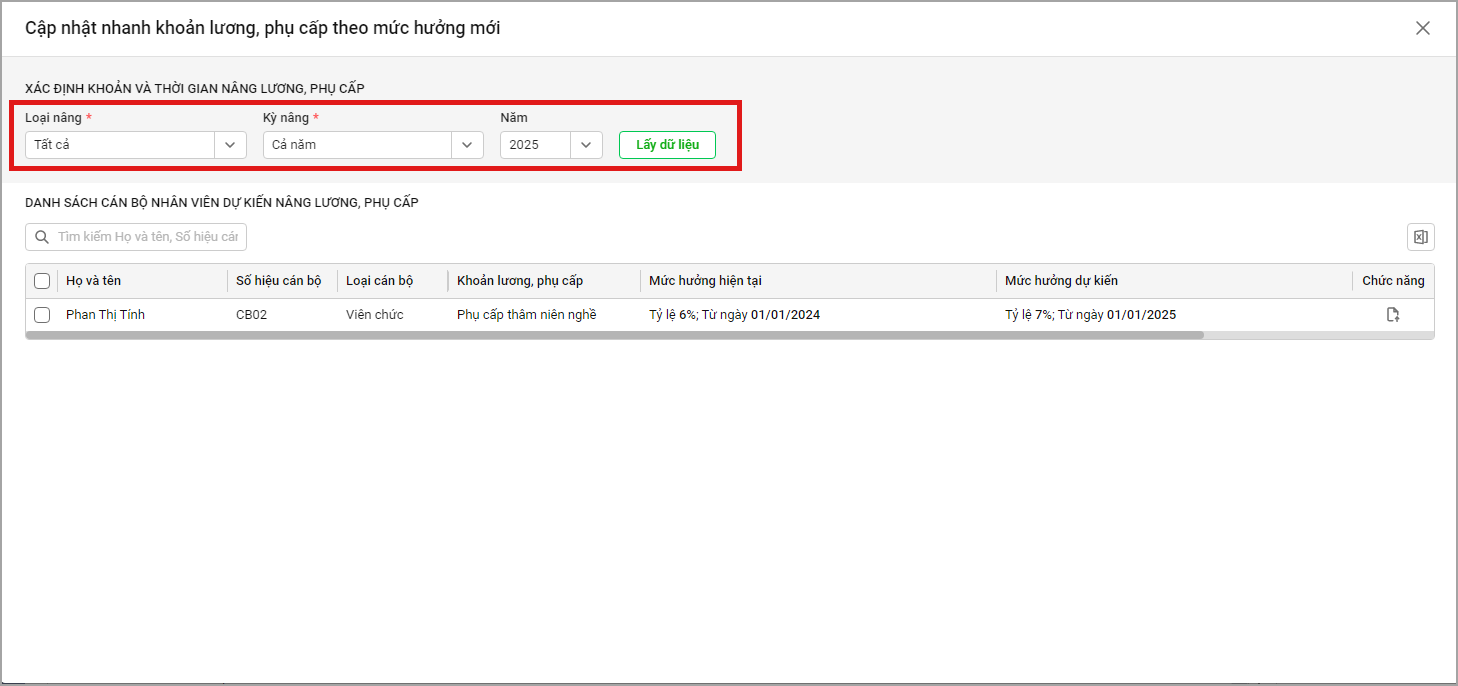 Ví dụ: Trong năm 2025, anh/chị muốn kiểm tra có bao nhiêu CBNV dự kiến nâng lương, phụ cấp. Lúc này, anh/chị cần chọn Loại nâng lương, kỳ nâng lương, Năm được nâng lương, chọn Lấy dữ liệu.