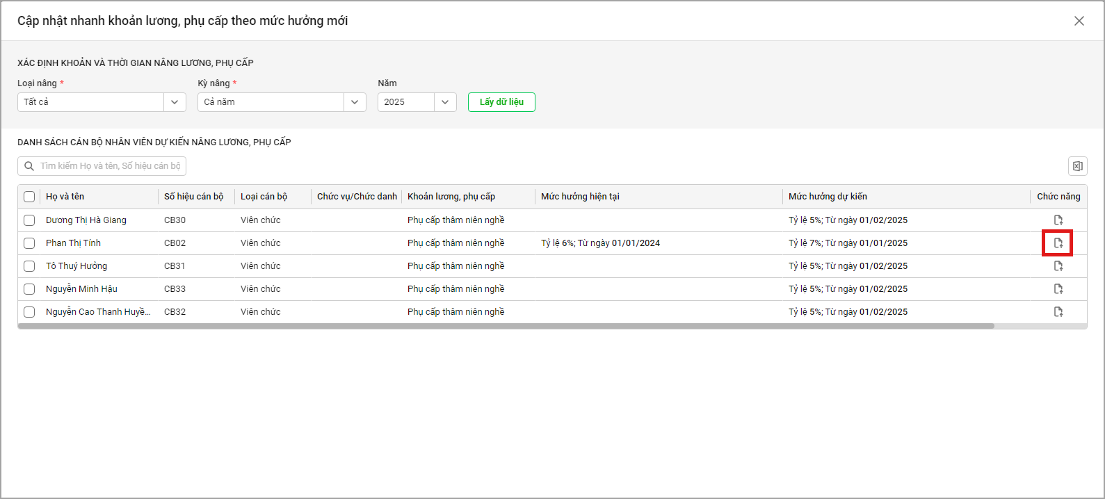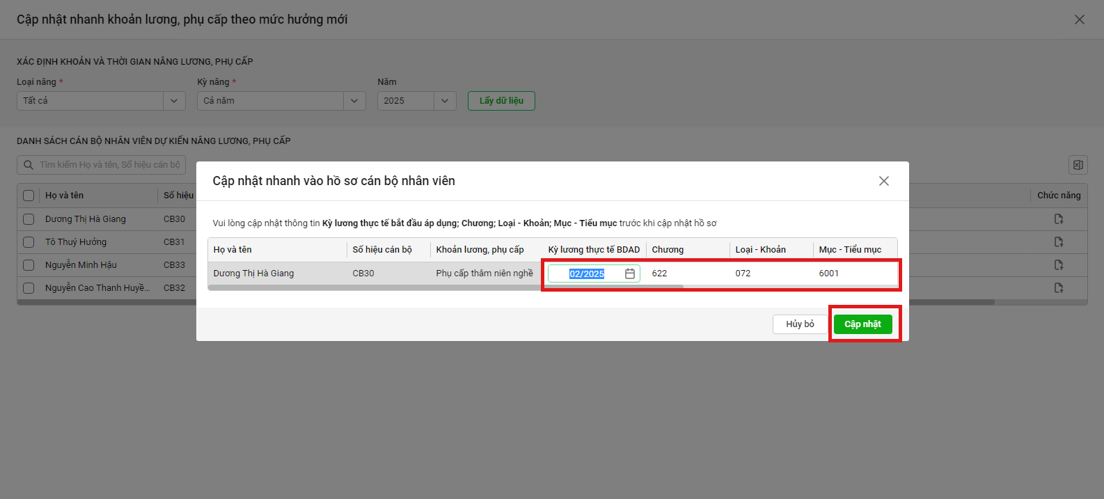 Bước 4. Khi anh/chị nhận được Quyết định nâng lương, phụ cấp chính thức cho những CBNV này, để cập nhật thông tin dự kiến nâng lương, phụ cấp đã nhập liệu trước đó vào hồ sơ CBNV để tiết kiệm thời gian nhập lại Quyết định, anh/chị chọn biểu tượng Cập nhật.