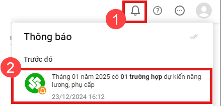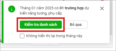 Hoặc nếu trường hợp đơn vị có CBNV dự kiến được nâng lương, phụ cấp, phần mềm sẽ hiển thị thông báo, anh/chị chọn vào thông báo để kiểm tra danh sách CBNV được dự kiến nâng lương, phụ cấp