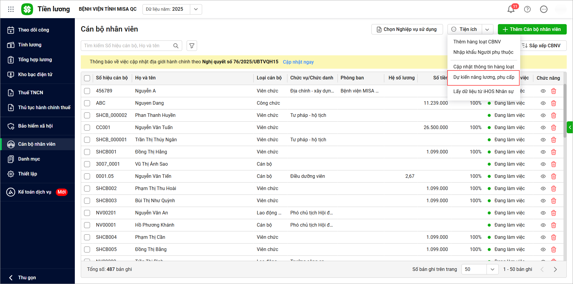 1. Anh/chị vào menu Cán bộ nhân viên, chọn mũi tên Tiện ích, chọn Dự kiến nâng lương, phụ cấp