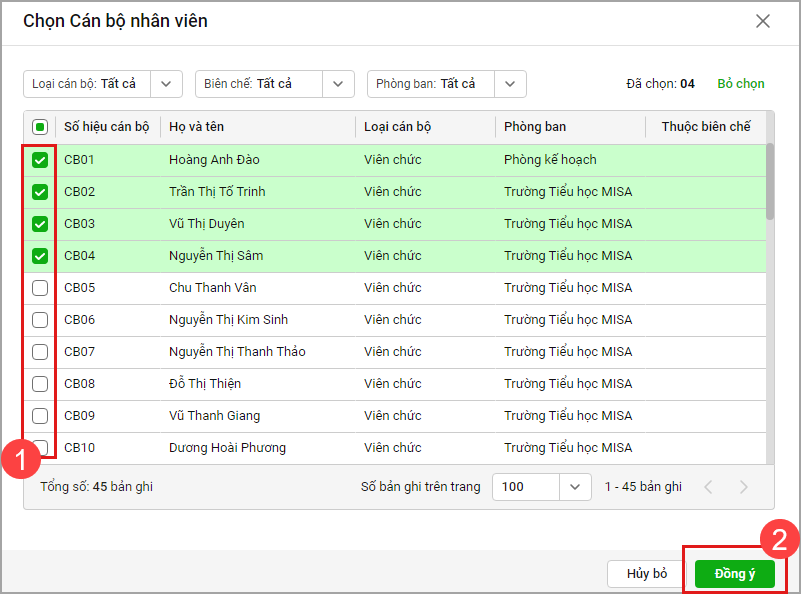 - Tích chọn đơn vị muốn chia sẻ báo cáo, chọn Đồng ý