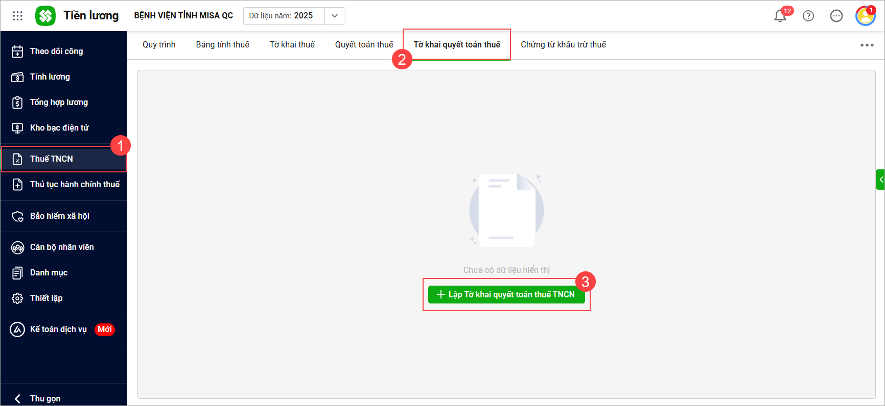 1. Anh/chị vào menu Thuế TNCN\Tờ khai quyết toán thuế\Lập Tờ khai quyết toán thuế TNCN