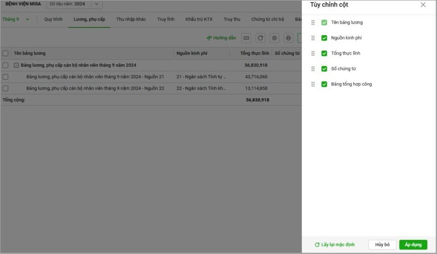 5. Nếu anh/chị muốn ẩn cột thông tin theo nhu cầu, anh/chị chọn tùy chọn ẩn/hiện cột tích chọn để hiện, bỏ tích chọn để ẩn cột thông tin (lưu ý: nếu muốn lấy lại thiết lập mặc định của chương trình chọn Lấy lại mặc định), sau đó chọn Áp dụng