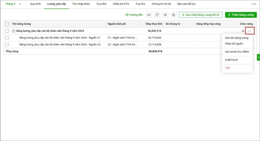 1. Sau khi lập bảng tính lương, anh/chị xác định nguồn chi trả tại đơn vị bằng các chọn Phân bổ nguồn