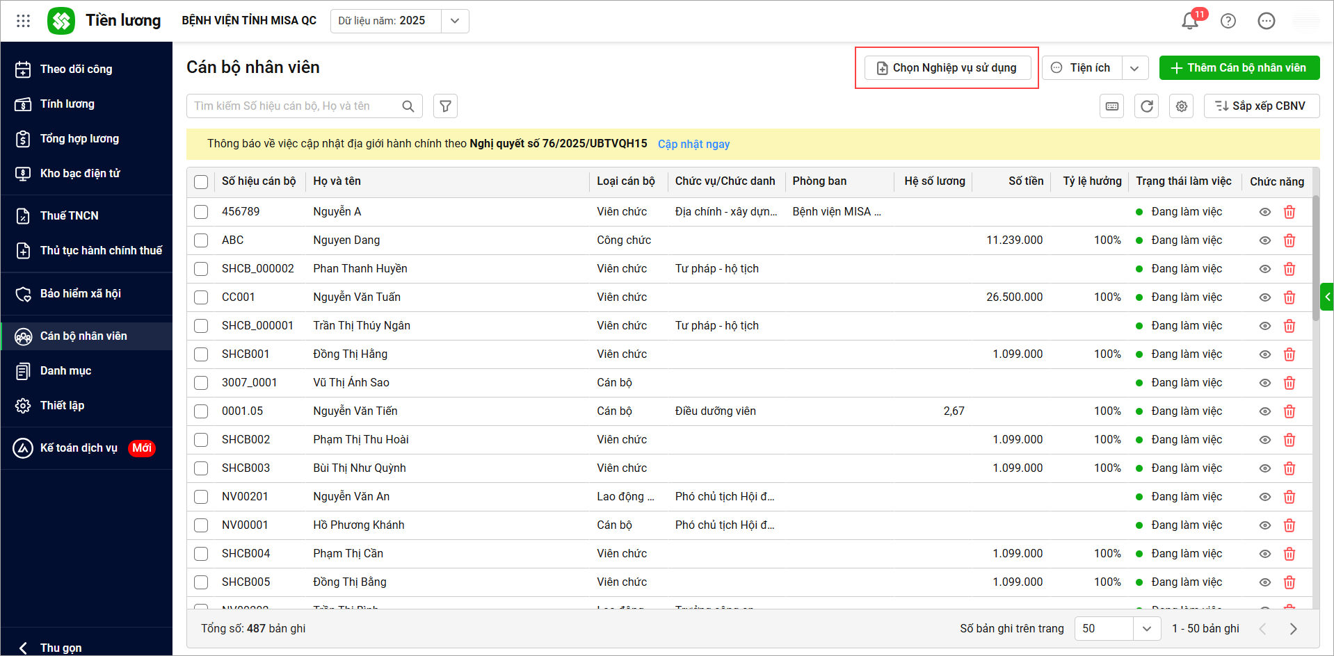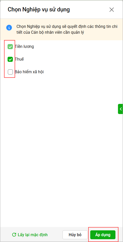 2. Tích chọn nghiệp vụ sử dụng tại đơn vị, khi khai báo thông tin CBNV chương trình sẽ hiển thị các trường thông tin cần khai báo tương ứng, nhấn Áp dụng để lưu thiết lập.