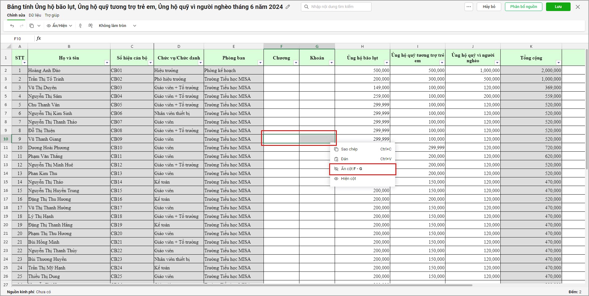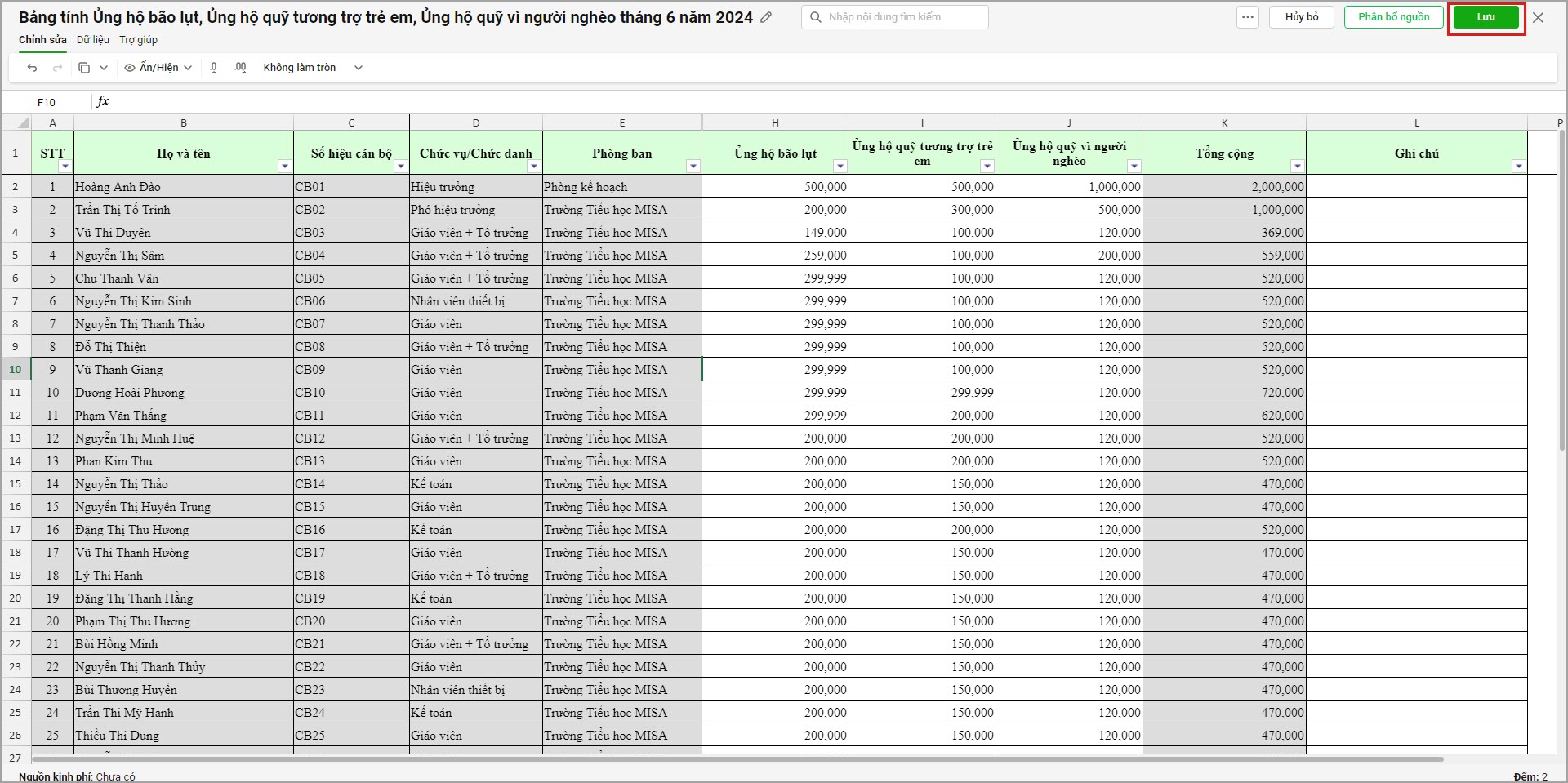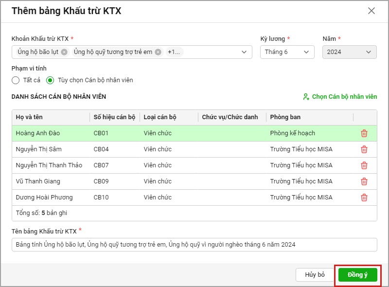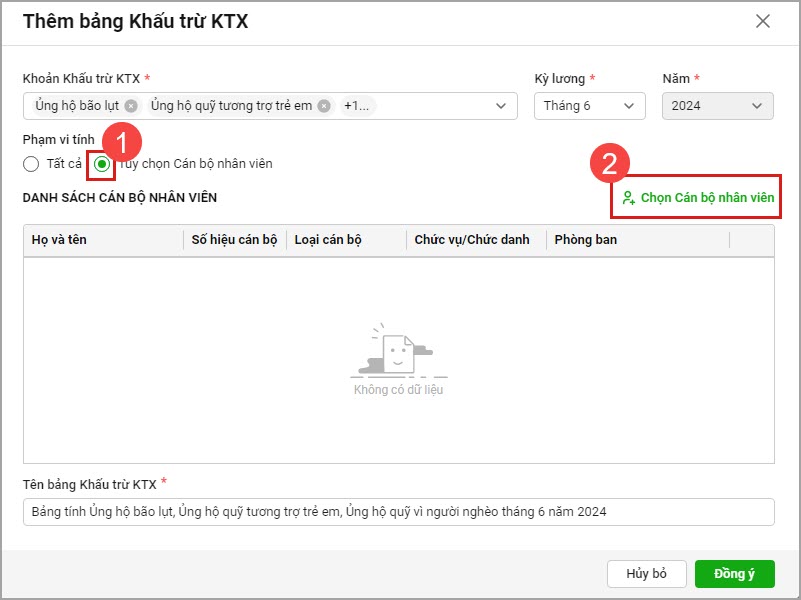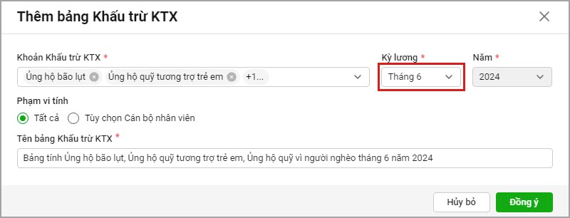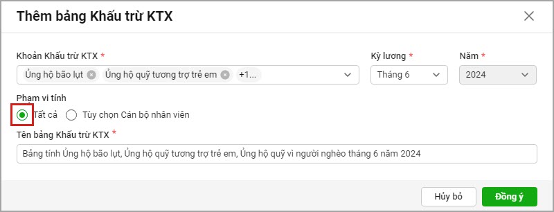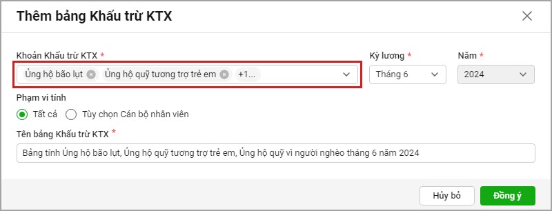 Ví dụ: anh/chị cần xem báo cáo 1% tiền đóng đảng phí, ủng hộ lũ lụt,… đã tính
