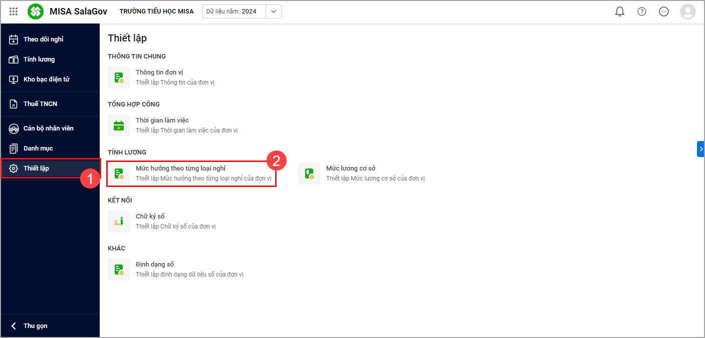 Bước 1. Vào menu Thiết lập\Mức hưởng theo từng loại công