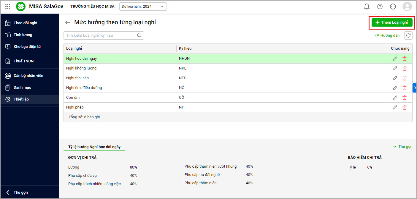 Bước 2. Khai báo loại nghỉ và thiết lập mức hưởng
