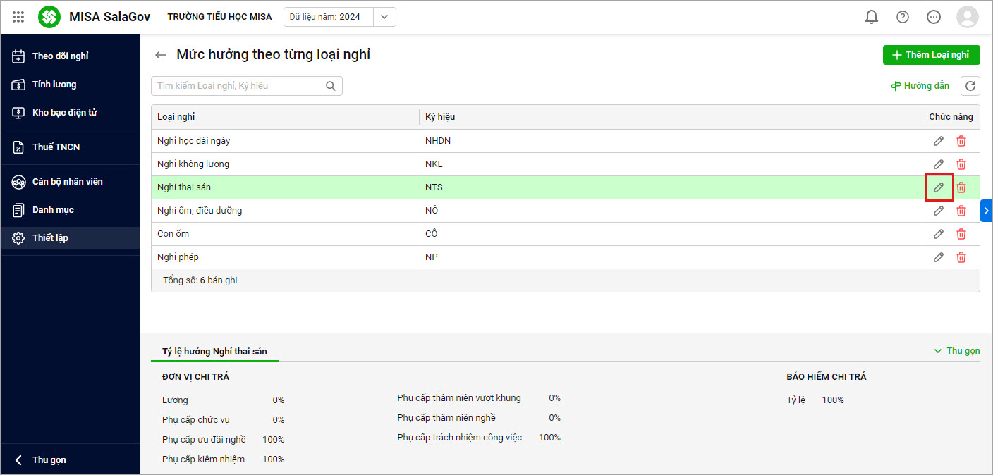 - Anh/chị tìm đến loại nghỉ đã có, nhấn biểu tượng hình cây bút cuối dòng để sửa.