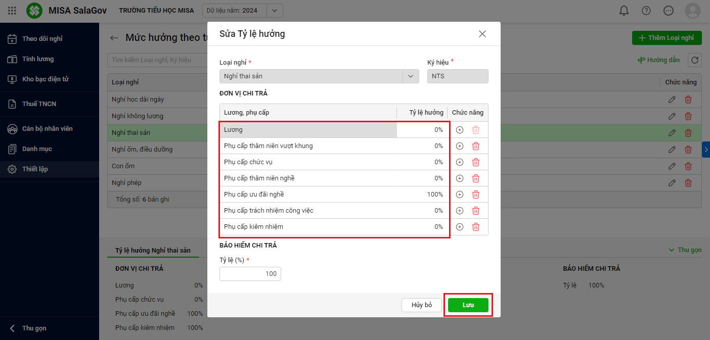 - Ở bảng đơn vị chi trả, nhập tỉ lệ chi trả tương ứng của đơn vị trả cho loại nghỉ.
