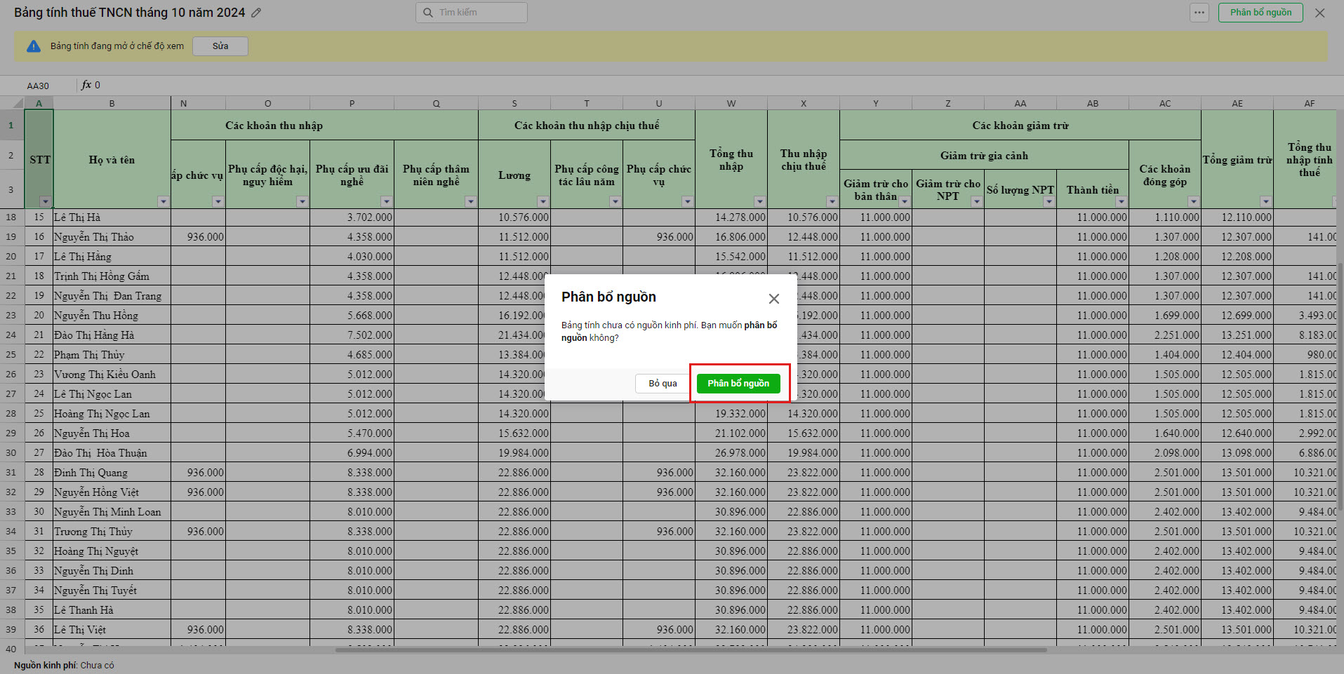 Bước 1: Sau khi lập bảng thuế TNCN, anh/chị xác định nguồn chi trả tại đơn vị bằng cách chọn Phân bổ nguồn.